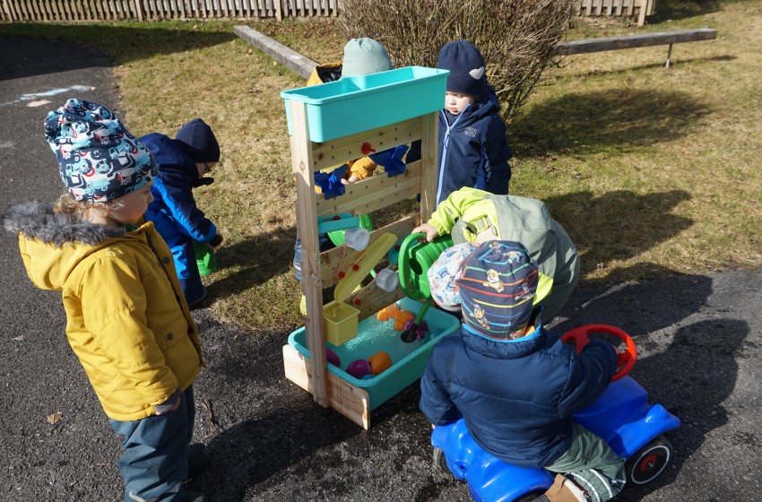 Auch bei uns in der Kibe zeigte sich der Frühling Stück für Stück. Dies nahmen wir zum Anlass wieder öfters in unseren Garten zu gehen. Dort spielten die Kinder im Sandkasten, fuhren mit den Fahrzeugen, schaukelten, balancierten, sprangen, experimentierten mit Wasser und machten viele Naturerfahrungen. Beispielsweise das genauere Betrachten einer Schnecke und ihrem Haus oder das Sammeln von Stöcken für das Bauen einer Burg.